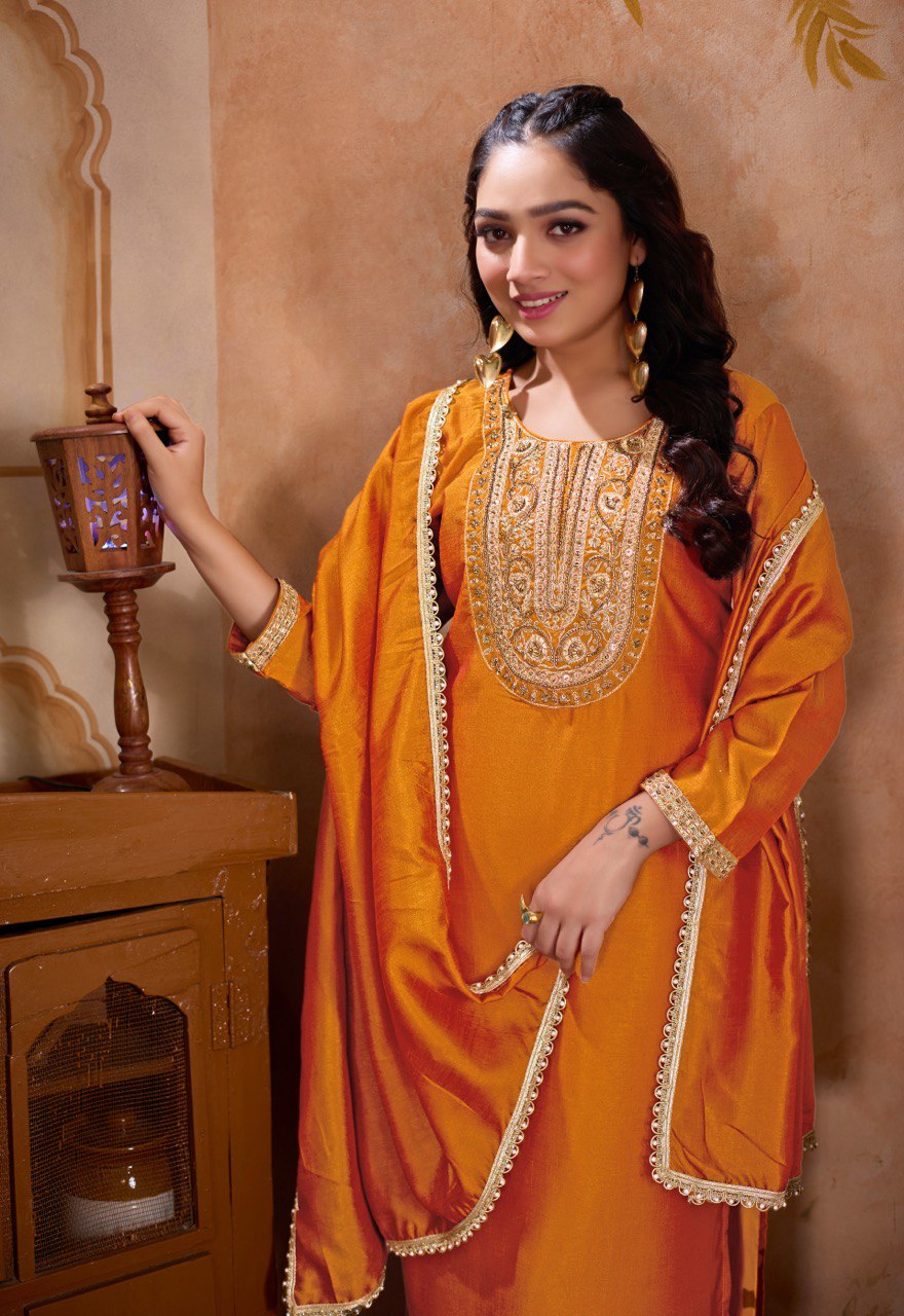 • Copper Thread Work Straight kurta With Trousers & Duppata